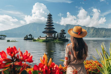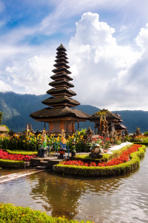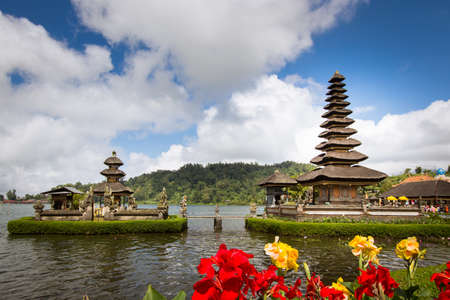 Pura Ulun Danu Bratan, a Hindu temple surrounded by flowers on Bratan lake, one of famous tourist attraction in Bali, Indonesia