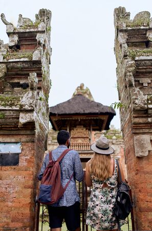 Couple of healthy curious, cultured female and male millennials looking at ancient traditional architecture outdoors, practicing tourism during trip together at foreign country