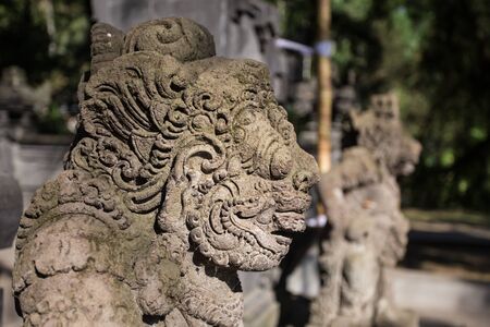 Ubud temple decorative stone statues. Balinese religious sacred architecture, stone curved sculptures