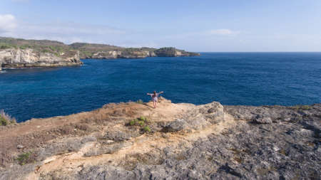 Aerial view of young girl stands on the edge of a cliff and looks at the sea Nusa Penida. Girl raising her hands up on the edge of the cliff enjoys the view of the ocean. Travel concept.