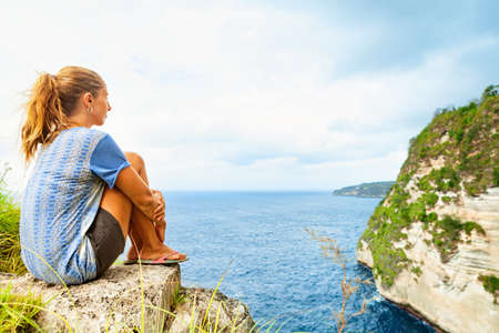 Traveler woman posing near Atuh beach and looks to ocean on Nusa Penida island, Indonesia.