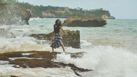 A young Indonesian girl is glad to big waves on the rocky shore of the island of Bali.