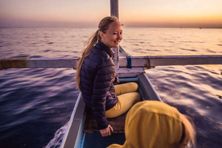 Young woman traveler meets dawn in the sea on a boat