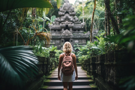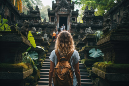 Generative AI : Tourist woman with backpack at vacation walking through the Hindu temple in Bali in Indonesia