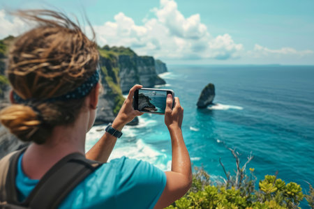 Travel content creator using mobile phone to capture images and videos