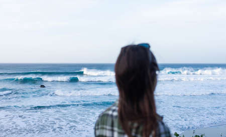 Dark-haired girl seen from behind looking at the sea. Strong waves in the Atlantic Ocean