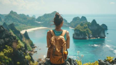 A woman is sitting on a rock overlooking a beautiful ocean. She is wearing a backpack and has a bottle of water next to her. Concept of relaxation and adventure