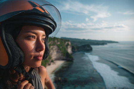 A rider in a helmet gazes thoughtfully at the scenic coastline during a serene sunset. The cliffs and ocean create a stunning backdrop for adventure and reflection.