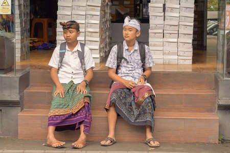 BALI, INDONESIA - OCTOBER 3, 2018: Balinese girls in traditional costume on a balinese family ceremony in desa Pejeng Kangi.