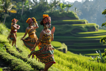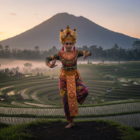 Balinese dancers in colorful traditional costumes performing in vibrant rice fields at sunrise.