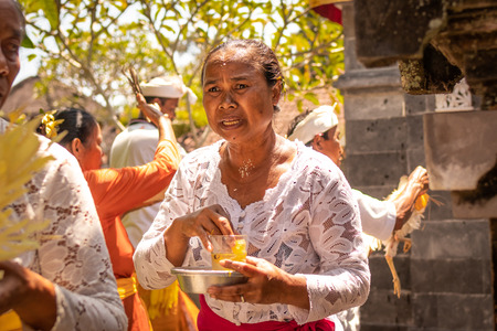 BALI, INDONESIA - SEPTEMBER 25, 2018: Balinese women in traditional clothes on a big ceremony in famous Tirta Empul Temple.