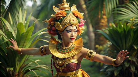 A young Bali female dancer is performing the Ramayana dance in a temple of Bali, in Indonesia.