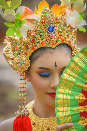 Denpasar, Bali island, Indonesia - June 23, 2018: Face portrait of beautiful young woman in traditional Balinese dance costume with golden headdress on street parade at art and culture festival.