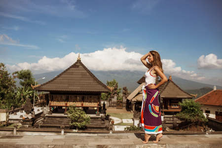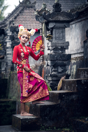 Beautiful woman in traditional costume at the ancient temple in Bali, Indonesia