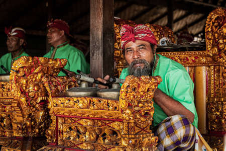 09.01.2020, Bali, Indonesia. A woman and a man in national costumes play in the performance. Galungan Holiday.