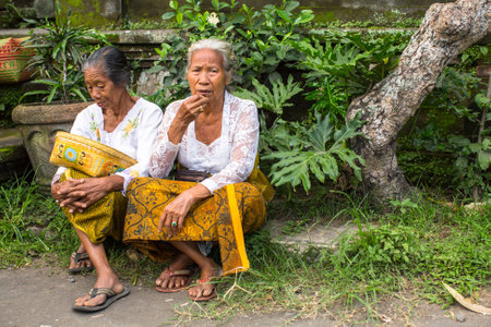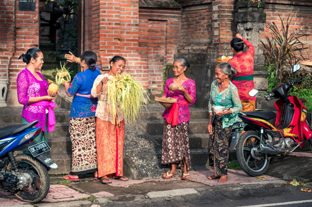 UBUD, INDONESIA - NOVEMBER 16, 2016: Smiling balinese women with the gifts for the gods in early morning. Everyday religious life of balinese women
