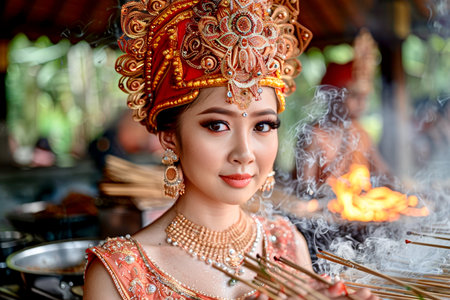 A Balinese woman in traditional attire and headdress smiles while holding a burning incense stick. The fragrant smoke adds a mystical aura, highlighting the vibrant colors against a warm backdrop.@240806_