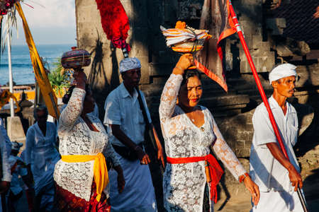 Bali, Indonesia - March 07, 2016: Balinese people in traditional clothes take part in the ceremonial procession during Balinese New Year celebrations.