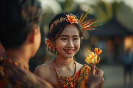 Generative AI Image of a Man Giving Flower to a Beautiful Balinese Girl with Traditional Clothes