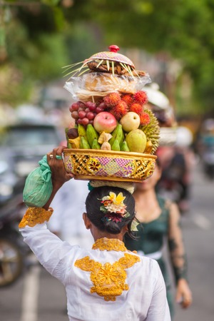 UBUD, INDONESIA - MARCH 2: Woman carrying basket on the head during the celebration before Nyepi (Balinese Day of Silence) on March 2, 2016 in Ubud, Indonesia.