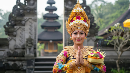Friendly balinese dancer showing a welcome gesture while smiling at the camera in the temple
