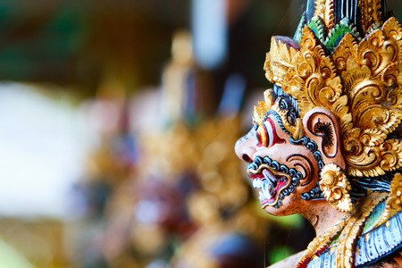 Traditional Balinese costume and mask Tari Wayang Topeng - characters of Bali culture. Temple ritual dance at ceremony on religious holiday. Ethnic festivals, arts of Indonesian people