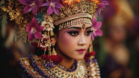 A stunning close-up of a traditional dancer showcasing her elaborate headdress and intricate jewelry, embodying cultural richness and grace.