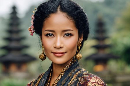Balinese woman posing for portrait in traditional clothing with a temple background