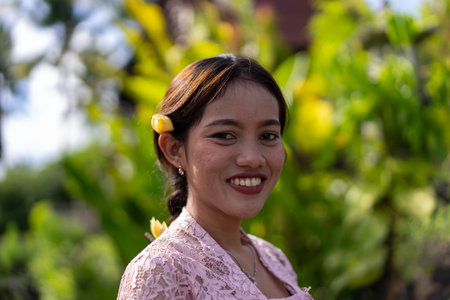beautiful and happy Asian Indonesian woman dressed in traditional Balinese religious custom holding incense stick and flowers offering outdoors at Bali temple in culture and tradition concept