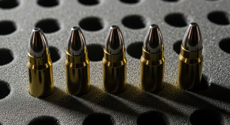 Five shiny golden bullets with silver tips are neatly arranged in a dark foam tray, casting strong shadows. This close up shot highlights ammunition for firearms.