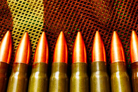 Bullets against Kalashnikov assault rifle. Cartridges 7.62 caliber for ak 47 closeup. Selective focus