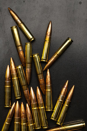 Bullets on gray background. Cartridges 7.62 caliber for Kalashnikov assault rifle. Top view, flat lay