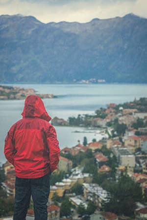 Man dressed in a red waterproof jacket standing on a lookout and looking at the view of the Kotor Bay and Old Town houses from above, Montenegro