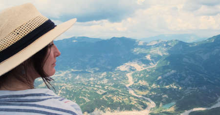 Close-up, woman traveler looking at mountains view from top. Happy woman traveler portrait in straw hat watching at scenery summer mountain landscape. Travel, trekking concept. Albania, Dajti