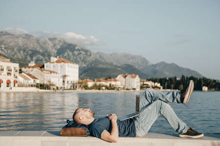 Handsome young man Lying and dreaming with laptop computer near the sea
