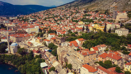 Aerial View to the Old Bridge in the heart of the Old City of Mostar, Bosnia and Herzegovina
