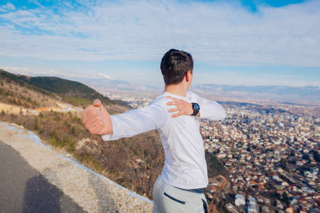 Strong male in his 20s stretching in the morning at winter while looking at his hometown in the valley.