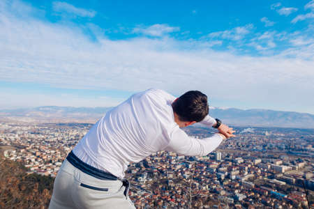 Man stands on the top of a mountain. Back view