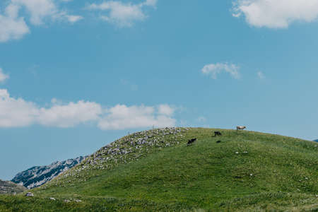 Idyllic summer day in the Durmitor National park. Location place Stozina peak, village Zabljak, Montenegro, Balkans, Europe. Scenic image of popular travel destination. Discover the beauty of earth.
