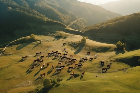 Generative AI : Green pastures with horses grazing in the mountains of Leon Spain