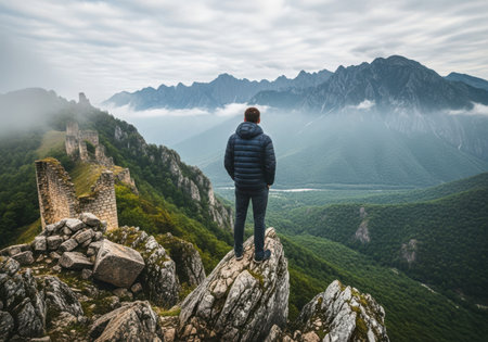 Man standing on the edge of a cliff looking at the mountains and fog
