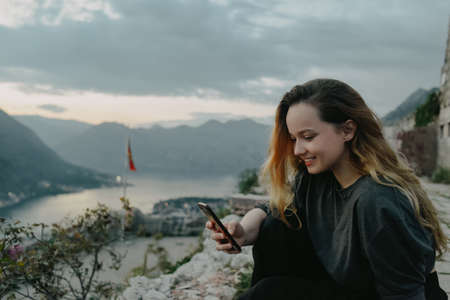 Woman on top of a mountain in Montenegro, Kotor. The girl looks at the smartphone, writes something, prints
