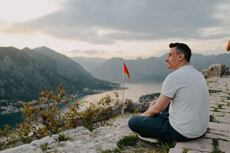 A man on top of a mountain in Montenegro, Kotor. The guy on the background of the sea and mountains is resting sitting on the stones. Traveling in Europe