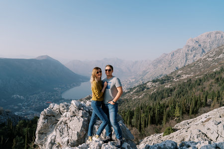 Smiling man hugging a woman in sunglasses standing on a rock above the Bay of Kotor. Montenegro