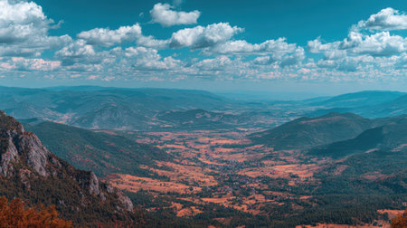 Experience a stunning panoramic view showcasing vast valleys and rolling hills under a vibrant blue sky filled with fluffy clouds. This nature landscape epitomizes peace.