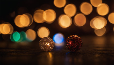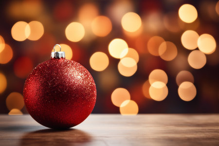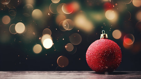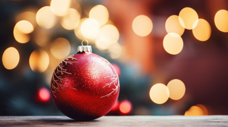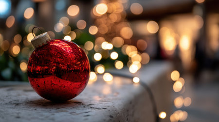 Vibrant red Christmas ornament rests on stone surface, surrounded by soft, glowing bokeh lights that create warm, festive atmosphere. scene evokes feelings of joy and celebration