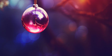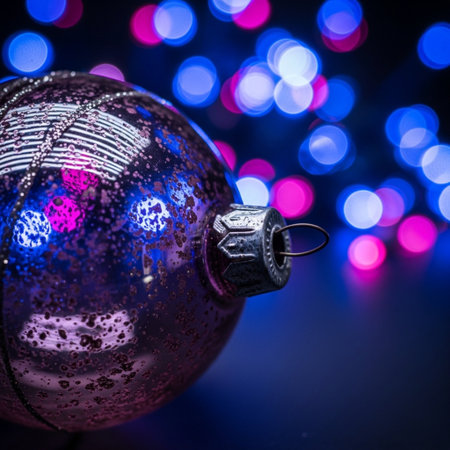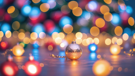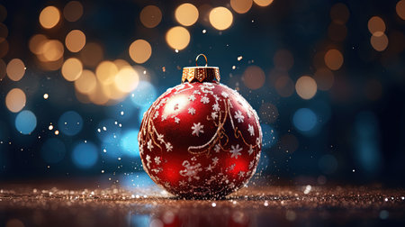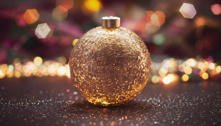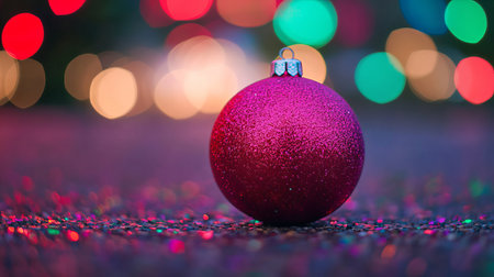 Christmas ball with blurred festive lights in the background, vibrant and magical atmosphere