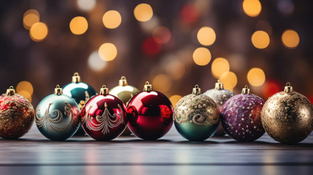 Colorful christmas balls on wooden table with bokeh background