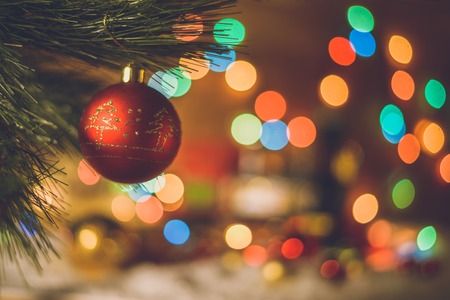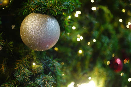Christmas bulbs and decorations. Abstract background bokeh christmas tree