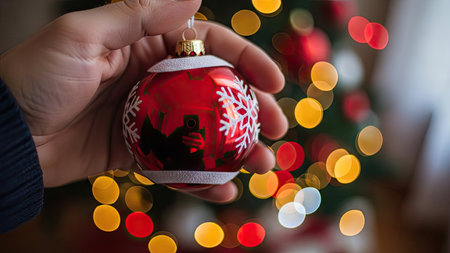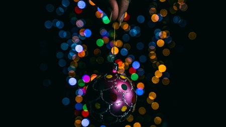 Holding Christmas decoration against bokeh lights background